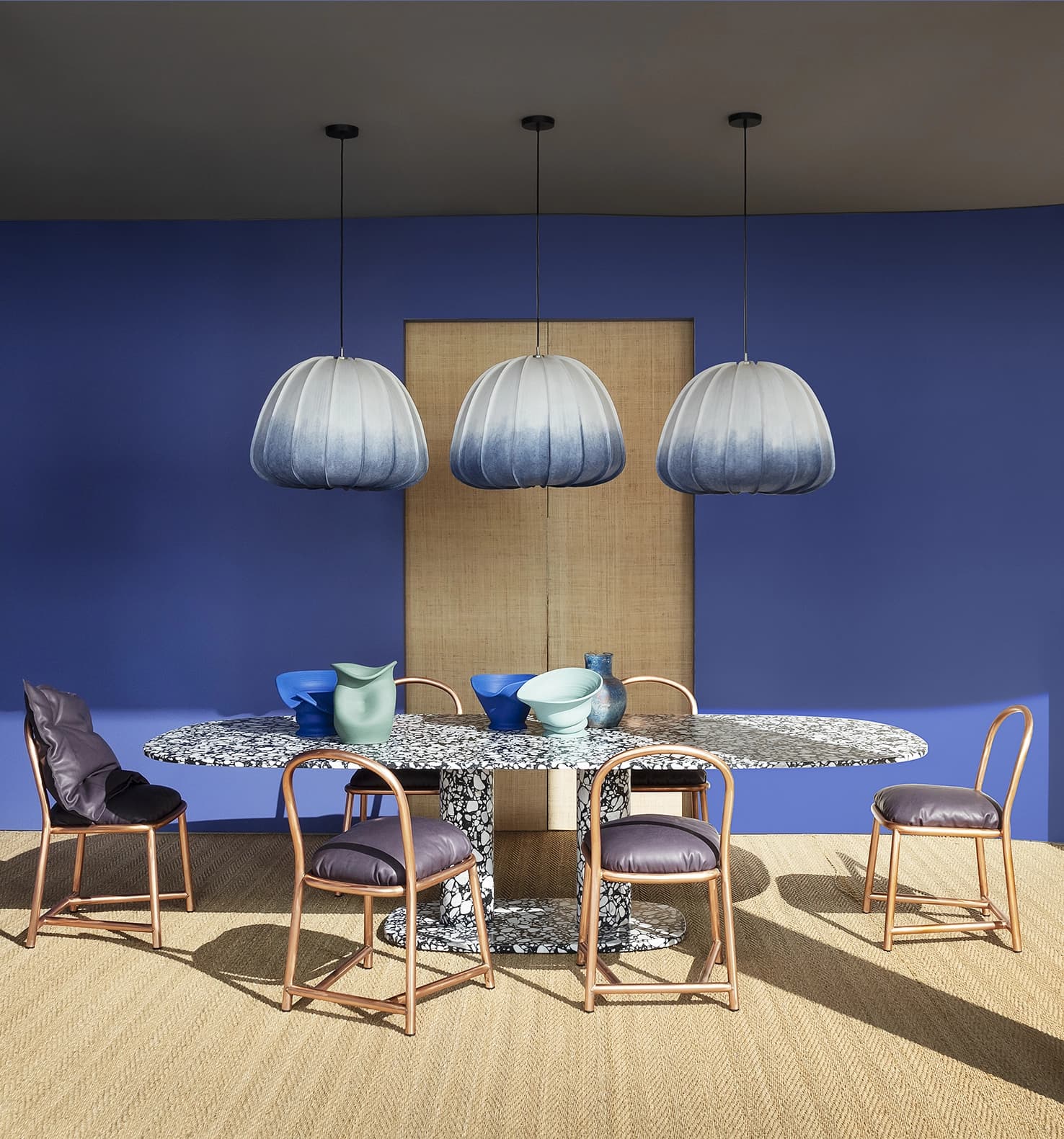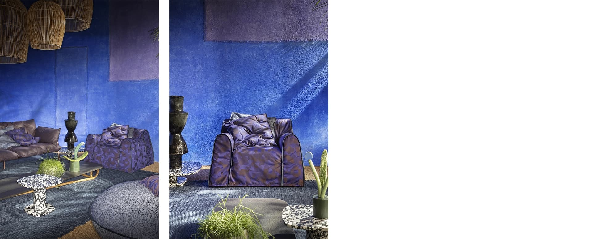 The star of the show is Paola Navone, whose open-air creations modulate the space with lightness while simultaneously tingeing the rooms with blue, her signature colour. It was also the perfect occasion to present Baxter’s new outdoor fabric: the Camo Blu. A camouflage of hues – from dark slate blue to midnight – evoking the ever-changing night skies.